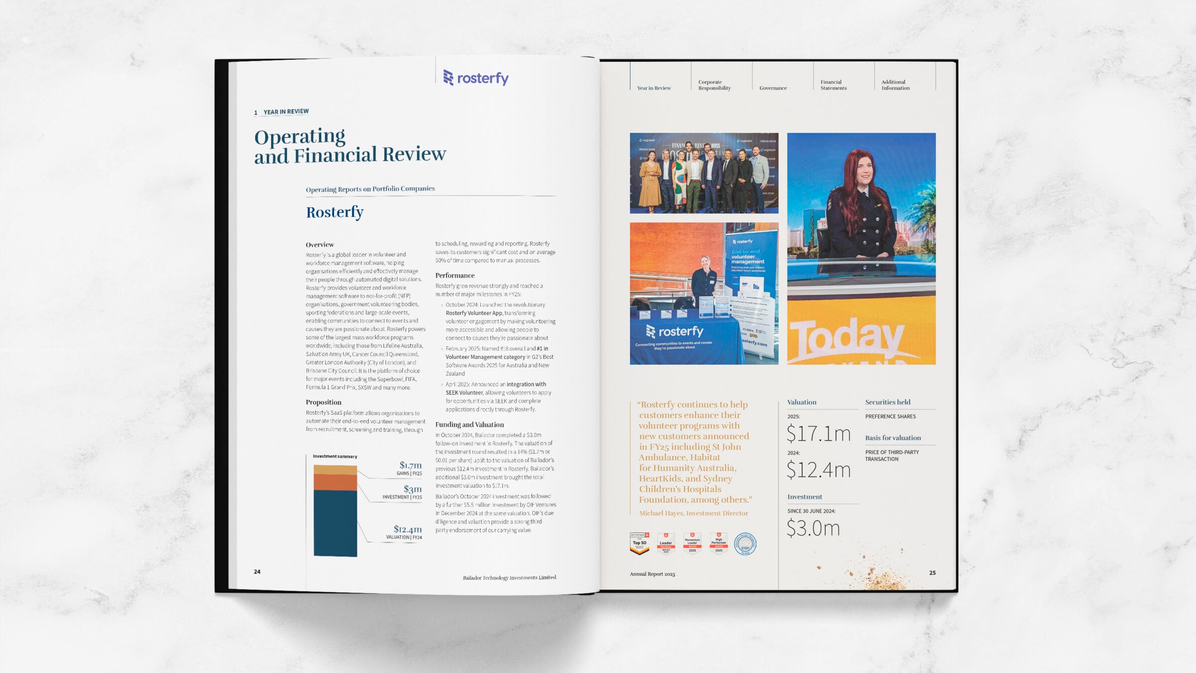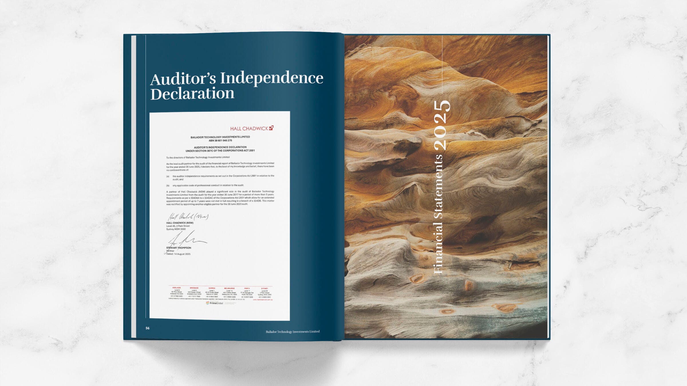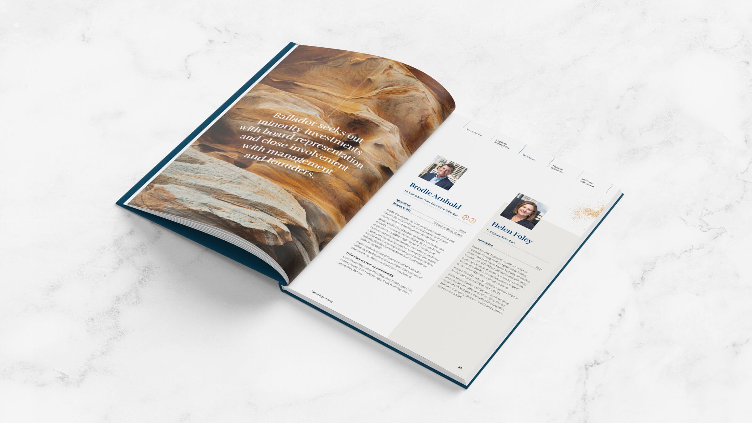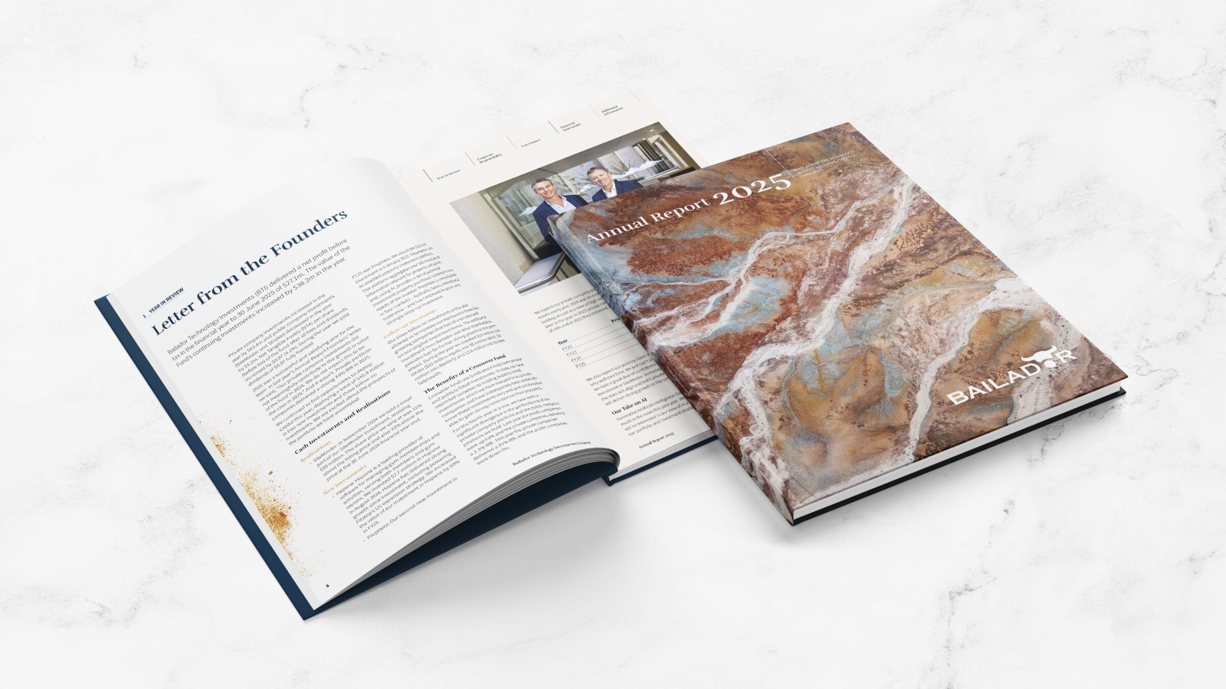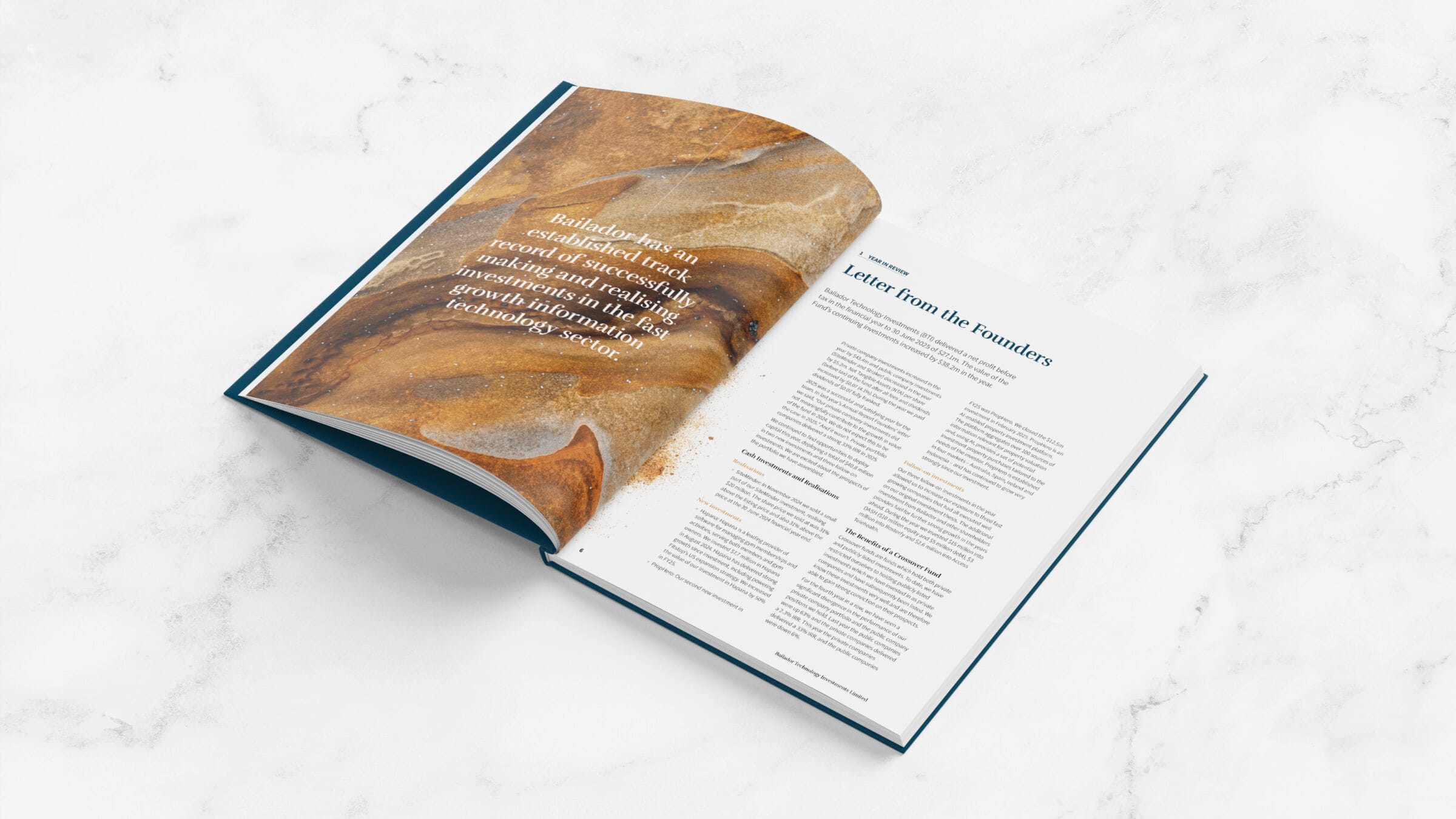 Fresco Creative worked alongside Bailador Technology Investments to prepare their 2025 Annual Report. The design was centred around a visual metaphor – sandstone. Being a sedimentary rock (stability, longevity, trust), sandstone is made up of trillions of small particles of sand (investors, ideas) which come together under pressure (entrepreneurs, investments) to create something solid and beautiful (an innovative and successful business, returns). The notion that rock builds up over time and creates layers year-on-year led to this concept being chosen as a suitable visual metaphor for the Annual Report.