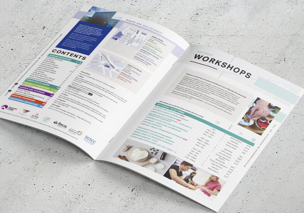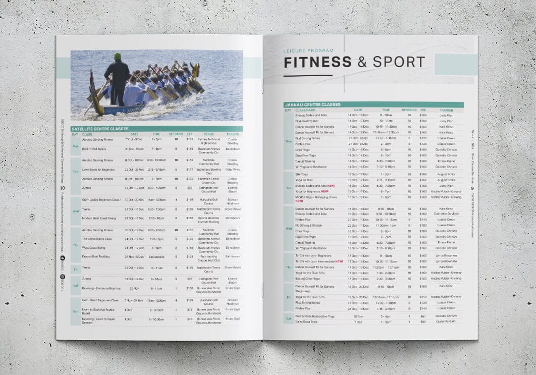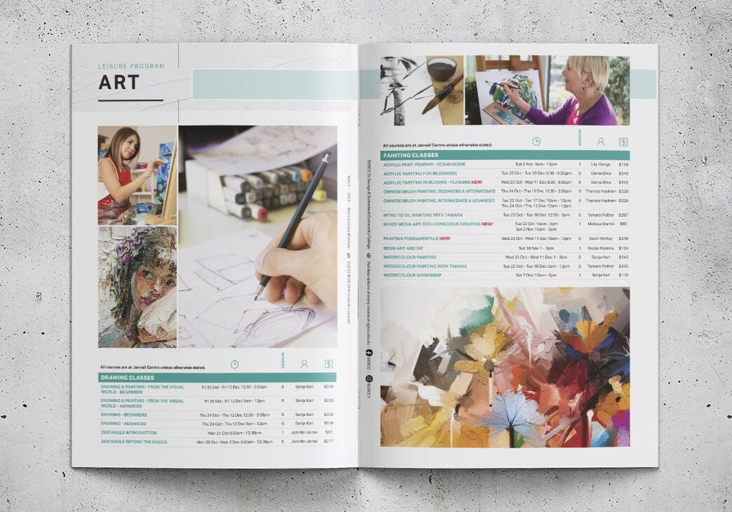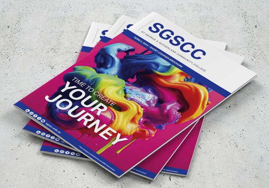 Fresco has proudly partnered with St George & Sutherland Community College (SGSCC) for over 15 years. In 2022, SGSCC approached us to refresh the design of their quarterly course brochures. Their goal was to breathe new life into the publications – creating a cleaner, more contemporary look that better represented the College’s various departments and moved away from the traditional, list-style layout. At the client’s request, Fresco retained the existing colour palette and base fonts but completely reimagined how the information was presented and experienced. The transformation was dramatic, delivering a strikingly modern design that delighted the client and became a project we’re incredibly proud of. Since then, the refreshed look and feel has been rolled out across all subsequent course brochures – right up to the latest Term 1, 2026 edition.